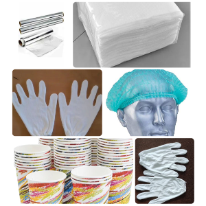 Tissue Papers Paper cups, Spoons, Fruit Fork Chaffing Fuel Gel Cloth / Plastic hand gloves Hair net Silver foil Table Cover Roll Cling film Cutlery wiping cloth & All Catering Disposable Items