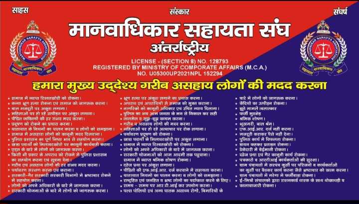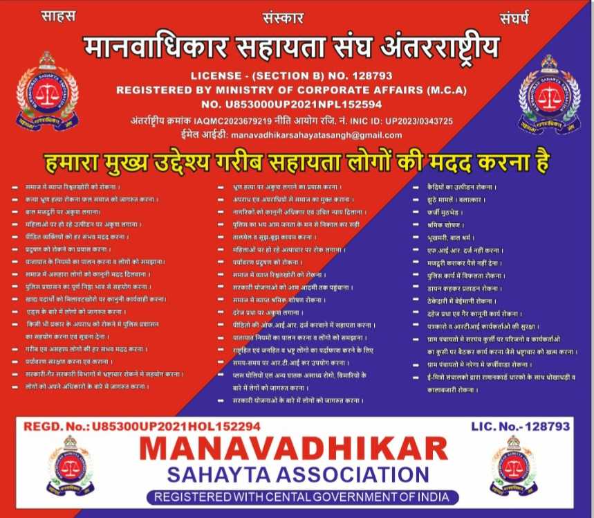 This organization is registered with the Ministry of Corporate Affairs, Delhi. This organization works under human rights. The objectives of the organization are women empowerment, stopping child labor and fighting against any atrocities by the government